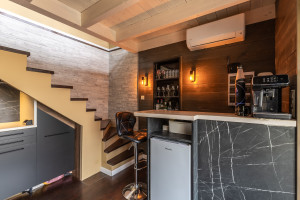 - A földszinten előtér, kis konyharész, zuhanyzós fürdőszoba, valamint egy fával fűthető szauna kapott helyet, amelyet úgy alakítottak ki, hogy az onnan áradó meleg levegő az egész épület fűtésére is alkalmas legyen – tudatosan megtervezett, különleges és otthonos megoldásként.