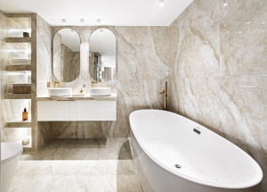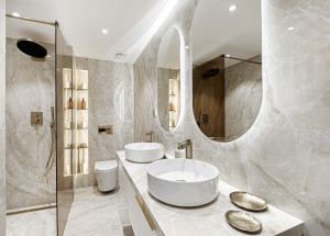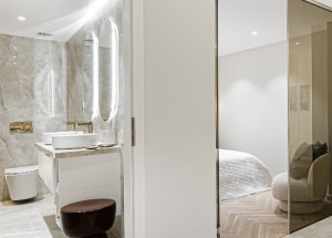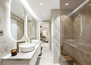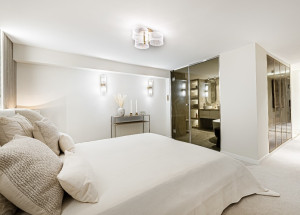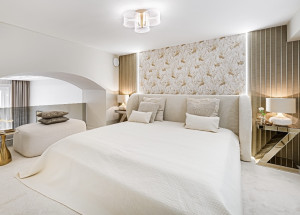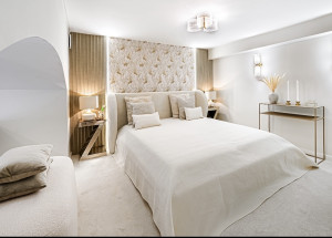 A pasztelltónusok, a textíliák és a világítástechnika exkluzív, mégis otthonos atmoszférát teremtenek.